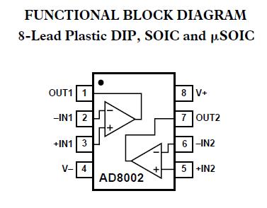AD8002AR absolute maximum ratings: (1)Supply Voltage: 12.6 V; (2)Internal Power Dissipation: Plastic DIP Package (N): 1.3W, Small Outline Package (R): 0.9W, μSOIC Package (RM): 0.6W; (3)Input Voltage (Common Mode): ±VS; (4)Differential Input Voltage: ±1.2 V; (5)Output Short Circuit Duration: Observe Power Derating Curves; (6)Storage Temperature Range N, R, RM: –65℃ to +125℃; (7)Operating Temperature Range (A Grade): –40℃ to +85℃; (8)Lead Temperature Range (Soldering 10 sec): +300℃.