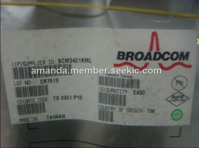 BCM3421KML features: (1)Single-chip direct conversion silicon tuner completes system design with Broadcom cable modem or set-top box; (2)DOCSIS/EuroDOCSIS 1.0/1.1/2.0; (3)Supports 64, 256, and 1024 QAM; (4)Input frequency range of 50 MHz through 930 MHz; (5)IF (intermediate frequency) output range of 4 MHz, 4.5 MHz, and 5 MHz; (6)For use in 6-MHz, 7-MHz, and 8-MHz systems; (7)High linearity across entire frequency range; (8)Differential signals for high noise immunity; (9)Integrated and cost-effective BOM: True single-chip tuner, Single 3.3V supply voltage, Fully integrated oscillator, Fully integrated channel selectivity; (10)Symmetrical IF output for direct connection to channel decode; (11)Received Strength Signal Indicator (RSSI) information provided through Broadcom Serial Control (BSC) bus; (12)Standby mode; (13)40-pin MLF package; (14)RoHS-compliant.