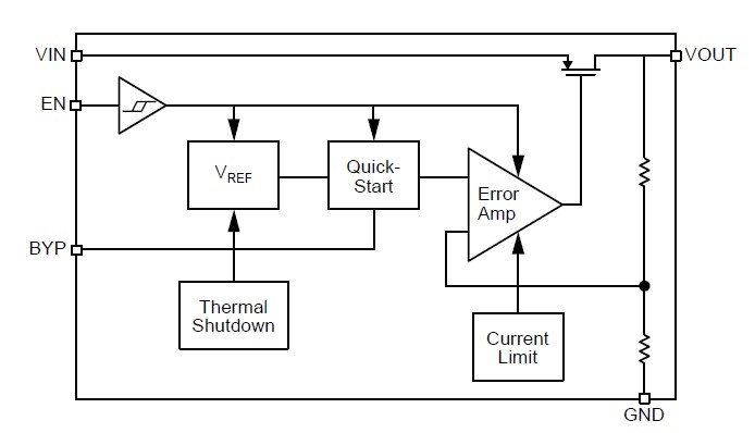 MIC5305-1.5YD5 features: (1)Ultra-low dropout voltage of 60mV @ 150mA; (2)Input voltage range: 2.25 to 5.5V; (3)Stable with ceramic output capacitor; (4)150mA guaranteed output current; (5)Low output noise 20μVrms; (6)Low quiescent current of 90μA total; (7)High PSRR, up to 85dB @1kHz; (8)Less than 30μs turn-on time w/CBYP = 0.01μs; (9)Thermal shutdown protection; (10)Current limit protection; (11)Tiny 6-pin 2mm 2mm MLFpackage; (12)Ultra-Thin 6-pin 2mm 2mm Thin MLFpackage; (13)Thin SOT-23-5 package.