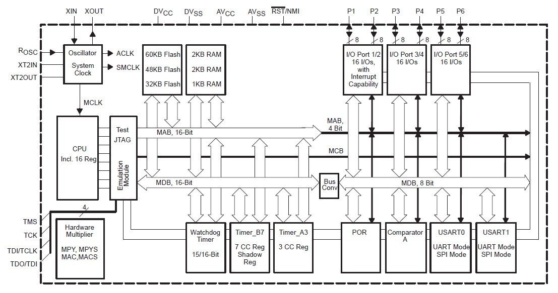 Features: (1)Low Supply-Voltage Range, 1.8V to 3.6V; (2)Ultralow-Power Consumption: Active Mode: 280 μA at 1 MHz, 2.2V; Standby Mode: 1.6μA; Off Mode (RAM Retention): 0.1μA; (3)Five Power-Saving Modes; (4)Wake-Up From Standby Mode in less than 6 μs; (5)16-Bit RISC Architecture, 125-ns Instruction Cycle Time; (6)12-Bit A/D Converter With Internal Reference, Sample-and-Hold and Autoscan Feature; (7)6-Bit Timer_B With Seven Capture/Compare-With-Shadow Registers; (8)16-Bit Timer_A With Three Capture/Compare Registers; (9)On-Chip Comparator.