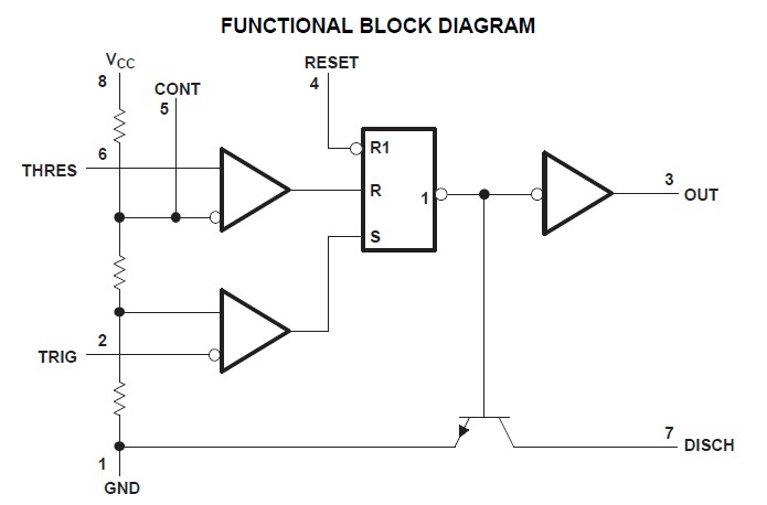 NE555DR features: (1)Timing From Microseconds to Hours; (2)Adjustable Duty Cycle; (3)Astable or Monostable Operation; (4)TTL-Compatible Output Can Sink or Source up to 200 mA.