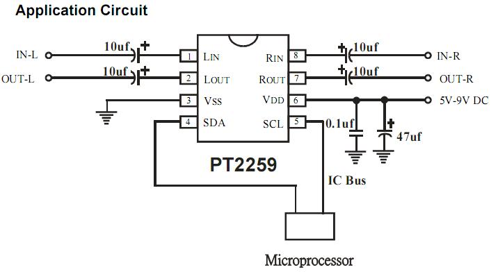 The PT2259-S is an 8-pin 2-channel volume controller which utilizes CMOS technology and incorporates the I2C interface control. The controller features an attenuation range of 0 to -79dB, low noise output, a high degree of stereo separation and requires only a small number of external components. The PT2259-S is an essential component for modern audio visual systems. The applications of the PT2259-S include Audio/visual surround sound systems, Car audio systems, Mini-compo systems, Computer multi-media speakers and Other audio applications.